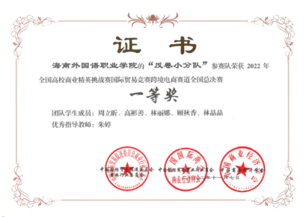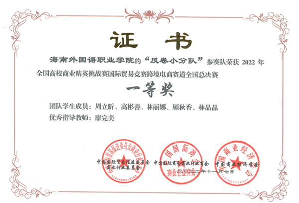 近日,由中國國際商會商業(yè)行業(yè)分會、中國國際貿(mào)易促進(jìn)委員會商業(yè)行業(yè)委員會共同舉辦的2022年全國高校商業(yè)精英挑戰(zhàn)賽國際貿(mào)易競賽跨境電商賽道全國總決賽落下帷幕,我校國際商務(wù)學(xué)院派出朱婷、廖完美2名指導(dǎo)老師帶領(lǐng)商務(wù)英語專業(yè)2020級周立昕、高彬善、顧秋香、林麗娜、林晶晶5名同學(xué)參賽,并最終斬獲全國一等獎的好成績。