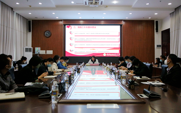 12月8日下午,學(xué)校黨委委員、副校長時(shí)秀梅為英語學(xué)院黨總支部和國際商務(wù)學(xué)院黨總支部黨員講授學(xué)習(xí)貫徹黨的二十大精神專題黨課,強(qiáng)調(diào)要以黨的二十大精神為指引,以實(shí)際行動(dòng)在本職崗位上擔(dān)當(dāng)作為,拼搏進(jìn)取,勇毅前行,將黨的二十大作出的決策部署落實(shí)到實(shí)處。