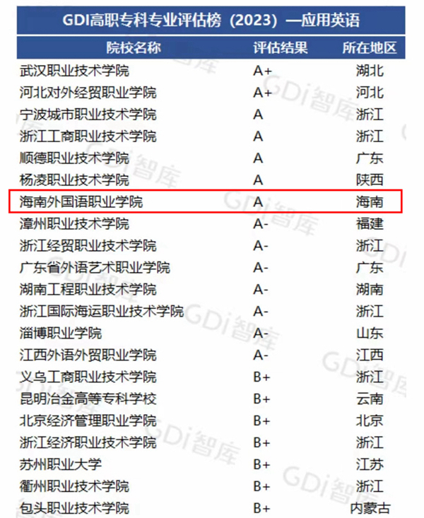 近日,“GDI智庫(廣州日報數(shù)據(jù)和數(shù)字化研究院)高職??茖I(yè)評估榜(2023)”正式發(fā)布,我校英語學(xué)院應(yīng)用英語專業(yè)被評為A檔專業(yè),列位該榜單專業(yè)排名第7名,充分彰顯了我校英語學(xué)院多年來深化產(chǎn)教融合、推動思想政治工作貫通人才培養(yǎng)體系的辦學(xué)成效。