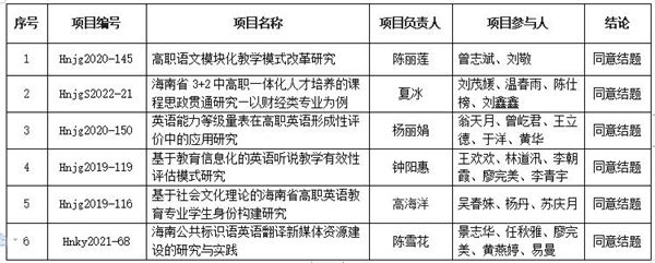 4月10日從《海南省教育廳關于公布2023年海南省高等學校教育教學改革研究和科學研究項目結(jié)題評審結(jié)果的通知》(瓊教高[2023]25號)獲悉,我校教師承擔的6項海南省高等學校教育教學改革研究項目、科學研究項目順利通過了結(jié)題驗收,可喜可賀,為學校又創(chuàng)出了一批高質(zhì)量的教科研成果,有力高效推動了我校“雙高”建設、高質(zhì)量發(fā)展。