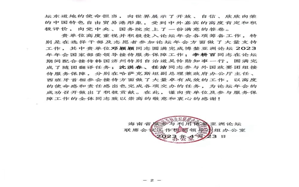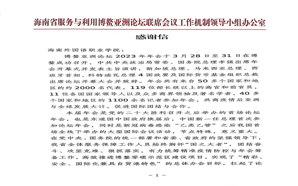 為此,海南省服務(wù)與利用博鰲亞洲論壇聯(lián)席會議工作機(jī)制領(lǐng)導(dǎo)小組辦公室特發(fā)來感謝信,向我校對博鰲亞洲論壇2023年年會的支持表示衷心感謝,肯定我校干部教師以高度的使命感和責(zé)任感出色完成各項(xiàng)交辦的任務(wù),為論壇年會的成功召開做出的積極貢獻(xiàn)。