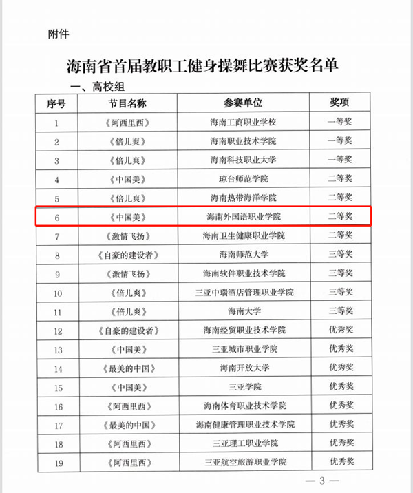 近日,海南省教育廳、海南省教育工會(huì)發(fā)出《關(guān)于海南省首屆教職工健身操舞獲獎(jiǎng)情況的通報(bào)》,其中,我校代表隊(duì)表現(xiàn)出色,從全省50支代表隊(duì)中脫穎而出,榮獲比賽高校組二等獎(jiǎng)的好成績(jī)。