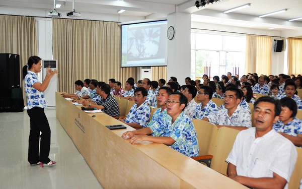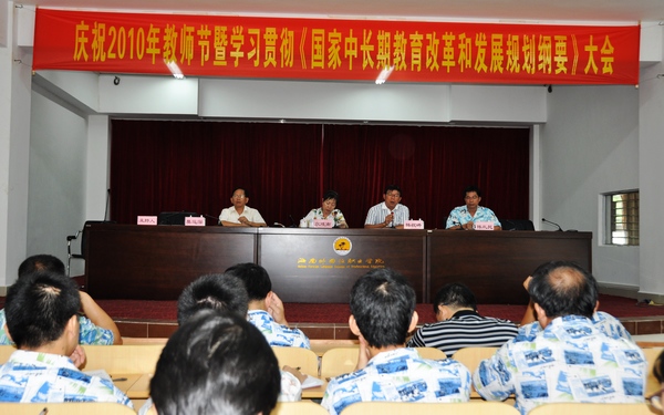 9月9日下午,我院慶祝2010年教師節(jié)暨學(xué)習(xí)貫徹《國家中長期教育改革和發(fā)展規(guī)劃綱要》大會在圖書館多功能報(bào)告廳隆重召開。學(xué)院黨委韓祝疇書記、袁陵南院長、陳禮民副院長、莫運(yùn)深副院長出席會議并在主席臺就坐,全體教職員工參加了大會。會議由莫運(yùn)深副院長主持。