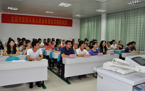 為進(jìn)一步提升文昌市旅游從業(yè)人員整體素質(zhì),為國際旅游島建設(shè)提供有力旅游人才支撐,9月25日上午,文昌市旅游從業(yè)人員業(yè)務(wù)素質(zhì)首期培訓(xùn)班在我院開班,市各旅游景區(qū)、賓館、酒店、旅行社等24家旅游企業(yè)的約50余名旅游從業(yè)人員代表參加了培訓(xùn)。此次培訓(xùn)班由文昌市旅發(fā)委主辦、我院協(xié)辦,市旅發(fā)委副主任符海文、學(xué)院副院長莫運(yùn)深、教務(wù)處處長劉明鵬等出席了開班儀式。學(xué)院旅游外語系主任張樹璜主持。