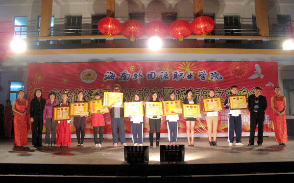 晚會在熱烈的氣氛中持續(xù)了兩個多小時,在晚會的最后,由我院領導及系部領導為此次晚會獲獎的表演節(jié)目以及獲獎個人進行了頒獎合影。