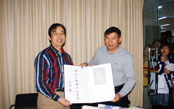 整個講座在輕松愉快的氣氛中進行,龐中華老師的書法家氣質(zhì)、詩人風采、長者風范給師生們留下了深刻而難忘的印象。講座后,龐中華老師欣然為我院題詞:“教育主宰未來,書寫改變?nèi)松?,并與我院領(lǐng)導(dǎo)等人合影留念。