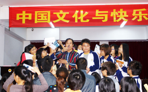 用故事闡釋演講的三個主題:激情、創(chuàng)新和技能,化枯燥的書法知識為生動的例子,龐中華老師風趣的語言引得全場掀起一波又一波的爆笑,讓第一次近距離接觸龐中華老師的我院師生對龐氏幽默產(chǎn)生深刻印象。比如在一次出訪日本演講的經(jīng)歷中,當被日本書法家問到指導(dǎo)老師是哪位時,自學(xué)成才的龐老師風趣地回答道:“一千多年前中國有個著名書法大家王羲之,他就是我的指導(dǎo)教師,不過本人卻只是他的函授學(xué)生;我買過他的書、讀過他的文章,這應(yīng)該算函授,不過王老師卻沒有給我發(fā)畢業(yè)文憑。”這個例子當即引起全場爆笑。