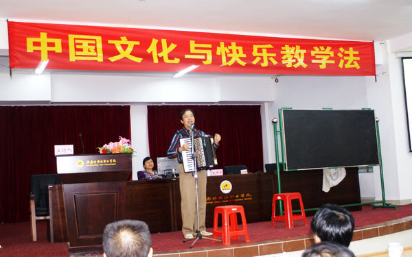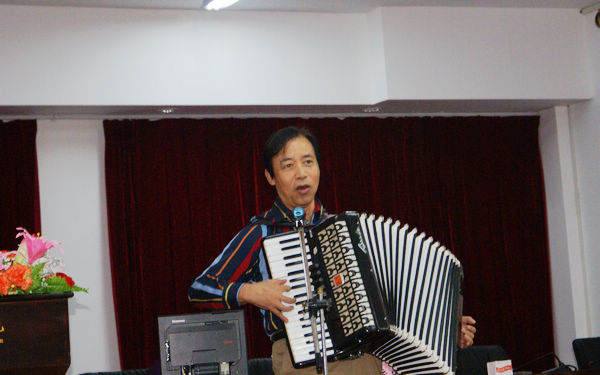 在近兩個小時的講座中,現(xiàn)場掌聲和笑聲不斷。龐中華老師以詼諧幽默的話語、坦誠平實的態(tài)度、機智堅定的性格、豐厚淵博的遠見卓識,憑借一部手風琴和一支硬筆,就將融音樂、演講和書法演示于一體的“快樂教學(xué)法”生動展示在觀眾面前,令在場觀眾折服。