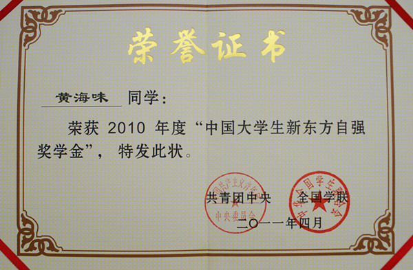 在2010年12月,榮獲國家勵志獎學(xué)金