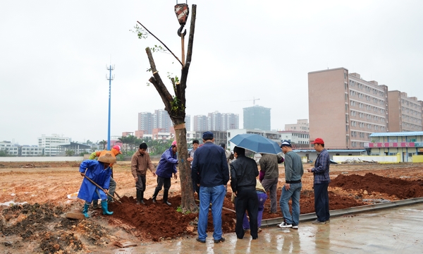 自“綠化校園、美化心靈”活動號召以來,我院根據(jù)自身實際,結(jié)合新校區(qū)的規(guī)劃建設(shè),陸續(xù)開展了一系列植物種草活動?;顒赢?dāng)天,雖飄著蒙蒙細(xì)雨,但大家植樹種草的身影依然隨處可見,只見他們挖樹坑、施沃土,在鏟車和吊車的配合下,用心為校園播下一棵棵新綠。僅僅一個下午的時間,一排排綠色樹苗就整齊地樹立在學(xué)院新校門及綜合大樓兩旁。