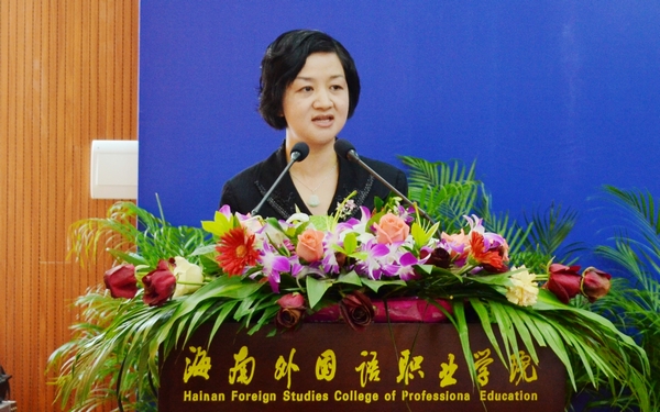 李渝鳳院長在簽約儀式上致歡迎辭。她代表學(xué)院黨政及全體師生員工向一直關(guān)懷和支持學(xué)院發(fā)展的各級領(lǐng)導(dǎo)、廣大華僑以及社會各界人士致以崇高的敬意和衷心的感謝。她指出,學(xué)院的發(fā)展凝聚著省委、省政府、省教育廳的關(guān)心和支持,飽含著文昌市委、市政府和全市人民以及社會各界的厚愛,此次廳市共建協(xié)議的簽署,將會為我院帶來新的發(fā)展機遇。她表示,今后學(xué)院將會積極抓住廳市共建這一歷史機遇,乘勢而上,繼續(xù)發(fā)揮培養(yǎng)高端技能型外語人才的優(yōu)勢,爭取用三到五年的時間把我院打造成特色鮮明的國家骨干高職院校,為社會培養(yǎng)更多的高端技能型外語人才,為我省實現(xiàn)科學(xué)發(fā)展、綠色崛起作出更大的貢獻(xiàn)。