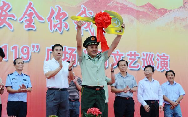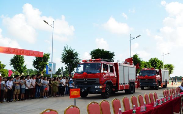 活動為2011年清剿火患戰(zhàn)役成績突出集體及個人進行頒獎;市公安局王振忠副局長、市公安消防支隊劉興建政委向東郊鎮(zhèn)政府專職消防隊、沿江社區(qū)志愿消防隊授旗;消防車接車儀式上,文昌市第一輛40米高云梯消防車也首次在廣大市民面前亮相,并由市委常委、市公安局局長林剛向文昌市公安消防支隊贈送消防車鑰匙。
