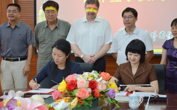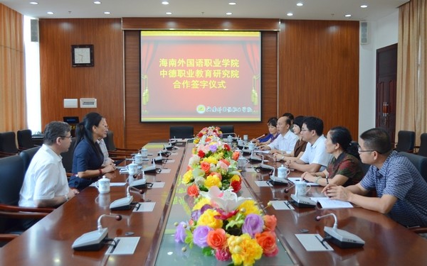 簽字儀式上,李渝鳳院長(zhǎng)對(duì)我院的基本情況作了簡(jiǎn)要介紹,指出我院作為全國(guó)僅有的兩所公辦外語(yǔ)類(lèi)高等職業(yè)院校之一,高度重視語(yǔ)言類(lèi)應(yīng)用型技能人才培養(yǎng),秉承“專家引領(lǐng)、中外融合、專兼結(jié)合”的治校原則,走國(guó)際化辦學(xué)路線,希望借助此次與中德職業(yè)教育研究院的合作契機(jī),加強(qiáng)溝通與合作,進(jìn)一步發(fā)揮雙方資源與優(yōu)勢(shì),共同為海南職業(yè)教育開(kāi)拓新的領(lǐng)域。中德職業(yè)教育研究院一行在儀式上也充分表示了對(duì)此次合作的期望和信心。