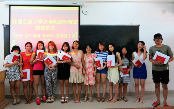 8月6日上午,韓國金浦大學(xué)暑假短期漢語研修班結(jié)業(yè)儀式在圖書館301多媒體教室成功舉行。我院對外合作交流處負(fù)責(zé)人、東語系負(fù)責(zé)人、授課教師代表、研修班學(xué)生及韓語系部分學(xué)生參加了結(jié)業(yè)儀式。