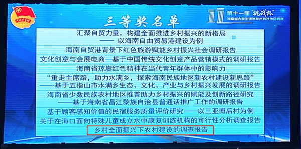我?!多l(xiāng)村全面振興下農(nóng)村建設(shè)的調(diào)查報告》旨在反映我校鄉(xiāng)村振興工作開展情況以及定安縣新竹鎮(zhèn)祖坡村委會、文昌市蓬萊鎮(zhèn)村民們對鄉(xiāng)村振興工作的關(guān)注度。我校團(tuán)隊(duì)在此次比賽取得佳績,是師生的共同努力和積極備賽的結(jié)果。在“挑戰(zhàn)杯”的青春擂臺上,我校學(xué)生關(guān)注地方經(jīng)濟(jì)社會發(fā)展需求,結(jié)合專業(yè)知識實(shí)地走訪調(diào)研,深入了解鄉(xiāng)村振興,彰顯同學(xué)們在青春賽道上,奮力奔跑、創(chuàng)造佳績,為海南自貿(mào)港建設(shè)貢獻(xiàn)力量的擔(dān)當(dāng)和作為。