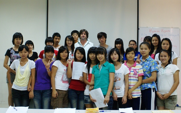 在圖書館多媒體2教室,一節(jié)別開生面的英語課正在進行。剛剛看完電影《The Stoning of Soraya M.》的同學(xué)們正圍繞老師提出的關(guān)于人權(quán)(Human Rights)的問題熱烈討論著。當(dāng)天的氣溫雖然很高,但同學(xué)們的熱情似乎比氣溫更高。這是出現(xiàn)在我院舉辦的暑期英語夏令營活動中的情景。