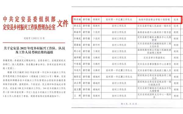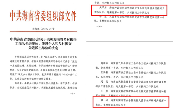 日前,省委組織部等單位表彰海南省鄉(xiāng)村振興工作對(duì)先進(jìn)集體、先進(jìn)個(gè)人和鄉(xiāng)村振興先進(jìn)派出單位。我校西方語言學(xué)院黨總支書記、派駐文昌市蓬萊鎮(zhèn)鄉(xiāng)村振興工作隊(duì)隊(duì)長(zhǎng)、蓬萊村第一書記、鄉(xiāng)村振興工作隊(duì)隊(duì)長(zhǎng)黃子艿,西方語言學(xué)院俄語專業(yè)教師、派駐文昌市東郊鎮(zhèn)碼頭村第一書記、鄉(xiāng)村振興工作隊(duì)隊(duì)長(zhǎng)郭峰在駐村工作期間連續(xù)兩年獲得文昌市鄉(xiāng)村振興“先進(jìn)個(gè)人”榮譽(yù)稱號(hào),今年獲得海南省鄉(xiāng)村振興“先進(jìn)個(gè)人”榮譽(yù)稱號(hào);國(guó)際旅游學(xué)院輔導(dǎo)員、派駐定安縣新竹鎮(zhèn)祖坡村第一書記、鄉(xiāng)村振興工作隊(duì)隊(duì)長(zhǎng)陳奕埔獲得定安縣鄉(xiāng)村振興“先進(jìn)個(gè)人”榮譽(yù)稱號(hào)。