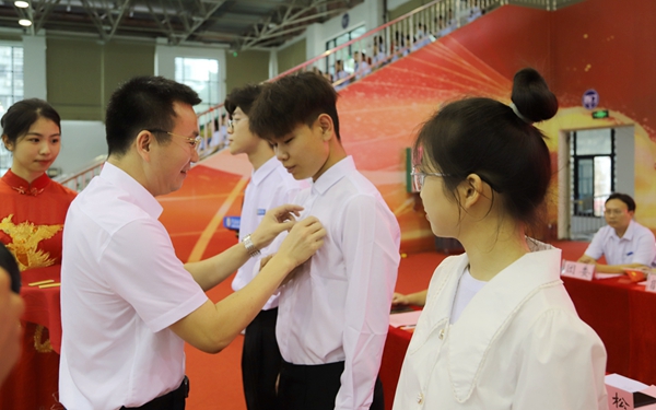 陳正強(qiáng)為學(xué)生代表佩戴校徽