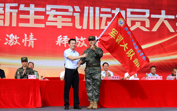 大會(huì)在莊嚴(yán)的國(guó)歌聲中拉開帷幕。陳正強(qiáng)宣布2023級(jí)新生軍訓(xùn)動(dòng)員正式開始,并為軍訓(xùn)大隊(duì)部授旗。