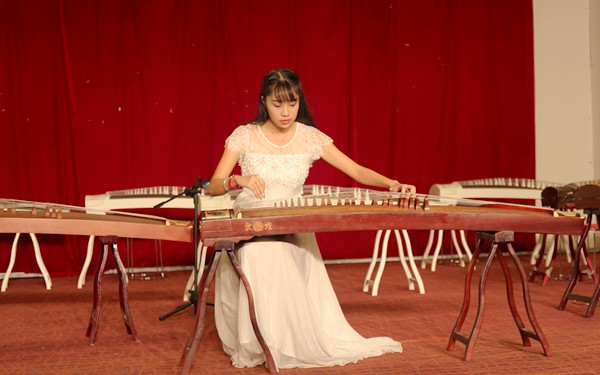 燈光下,身著白色長(zhǎng)裙的溫海欣坐落于舞臺(tái)中央。一聲弦起,技術(shù)嫻熟的她低伏在古箏上,雙手按著,一曲《戰(zhàn)臺(tái)風(fēng)》在她指間緩緩奏響,曲調(diào)時(shí)而高山流水,時(shí)而清脆婉轉(zhuǎn),溫海欣用嫻熟的技術(shù)把古箏的特點(diǎn)發(fā)揮得淋漓盡致,深沉柔美的弦音仿佛雨打芭蕉。