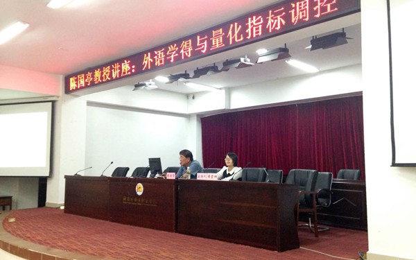 講座中,陳國(guó)亭教授圍繞講座主題,從“‘習(xí)得’和‘學(xué)得’的概念”、“尊重外語(yǔ)‘學(xué)得’規(guī)律”、“外語(yǔ)‘學(xué)得’的基本條件和要求”、“外語(yǔ)‘學(xué)得’的特殊性”、“外語(yǔ)教學(xué)過(guò)程的量化指標(biāo)和對(duì)策”、“外語(yǔ)教學(xué)效果檢測(cè)的量化指標(biāo)體系”以及“外語(yǔ)學(xué)得是一個(gè)系統(tǒng)工程”等七個(gè)方面切入,娓娓向師生道出“學(xué)得”的概念理論和實(shí)際運(yùn)用知識(shí)。在闡述“外語(yǔ)學(xué)得是一個(gè)系統(tǒng)工程”內(nèi)容時(shí),陳國(guó)亭教授認(rèn)為,熟練掌握一門(mén)外語(yǔ)并能在實(shí)際生活中很好運(yùn)用,需要一定時(shí)間的詞匯積累和大量的口譯及筆譯訓(xùn)練,高校外語(yǔ)專(zhuān)業(yè)整體的外語(yǔ)學(xué)習(xí)氛圍非常重要,需要有效的頂層設(shè)計(jì)和調(diào)控,提高學(xué)生的基準(zhǔn)成才率是一個(gè)學(xué)校教育教學(xué)設(shè)計(jì)的基本目標(biāo)。