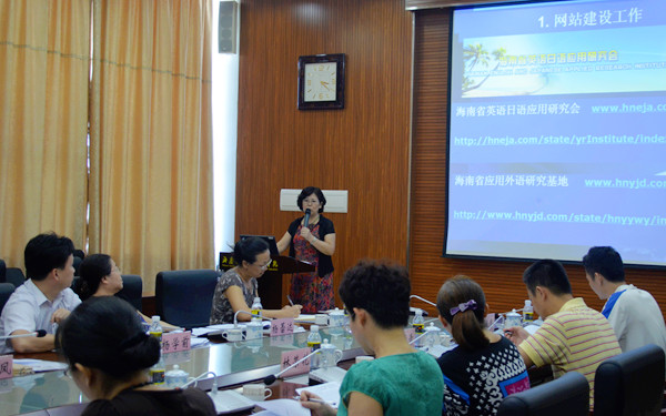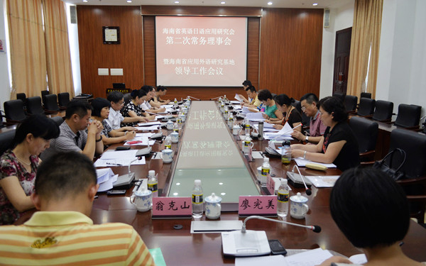 7月10日下午,海南省英語日語應(yīng)用研究會第二次常務(wù)理事會暨海南省應(yīng)用外語研究基地領(lǐng)導(dǎo)工作會議在我院召開綜合樓7樓第一會議室召開。來自全省12所高校的16名外語教學(xué)專家、研究會理事和常務(wù)理事參加會議,共同就英語日語應(yīng)用研究會和應(yīng)用外語研究基地2014年下半年工作方案、領(lǐng)導(dǎo)職能分工、日常活動開展等議題進(jìn)行討論、確定。