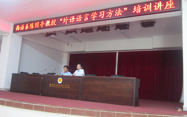 在講座過(guò)程中,陳國(guó)亭教授從他多年從事外語(yǔ)教學(xué)教研的經(jīng)驗(yàn)出發(fā),深入淺出地向?qū)W生闡述了外語(yǔ)語(yǔ)言學(xué)習(xí)的要義。他說(shuō),首先,要真正地學(xué)好一門語(yǔ)言,必須要有持之以恒的決心,要克服懶惰松懈的思想;第二,學(xué)好一門語(yǔ)言,單詞是基礎(chǔ),沒(méi)有單詞量的積累是不可能真正掌握一門語(yǔ)言的,而要記好單詞則要靠不斷地識(shí)記和復(fù)習(xí);第三,學(xué)好一門語(yǔ)言,要學(xué)會(huì)密切地將我們所學(xué)的語(yǔ)言和我們?nèi)粘I钪械囊磺袑?duì)應(yīng)起來(lái),要隨時(shí)隨地想到日常生活中用漢語(yǔ)表達(dá)的意思如何用所學(xué)外語(yǔ)語(yǔ)言來(lái)表達(dá),這是因?yàn)槲覀冋Z(yǔ)言學(xué)習(xí)的最終目的是實(shí)現(xiàn)學(xué)以致用;第四,要堅(jiān)持每天背誦文章或句子,讓所學(xué)語(yǔ)言走入自己內(nèi)心的世界。陳國(guó)亭教授最后指出,我們學(xué)習(xí)外語(yǔ)語(yǔ)言的人,每個(gè)人都要有自己的目標(biāo),每一天都要有自己的學(xué)習(xí)計(jì)劃,只要能持之以恒,堅(jiān)定信心,就一定能學(xué)好。而這種語(yǔ)言學(xué)習(xí)的過(guò)程,不僅僅是讓我們的專業(yè)能力得到不斷提升,更是會(huì)給我們?nèi)松膯⒌?,讓我們一生受益無(wú)窮。