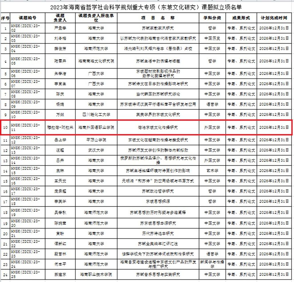 近日,海南省社科聯(lián)和海南省東坡文化研究與傳播中心公布了2023年海南省哲學(xué)社會(huì)科學(xué)規(guī)劃重大專項(xiàng)(東坡文化研究)課題立項(xiàng)名單。我校德語外教穆拉德·阿拉米教授主持申報(bào)的“德法東坡文化傳播研究”獲得立項(xiàng)。這是我校首次獲批海南省哲學(xué)社會(huì)科學(xué)規(guī)劃重大專項(xiàng)課題,同時(shí)也是首次由外籍教師牽頭組織申報(bào)的海南省哲學(xué)社會(huì)科學(xué)規(guī)劃課題,實(shí)現(xiàn)了我校在省級(jí)哲學(xué)社會(huì)科學(xué)規(guī)劃重大專項(xiàng)課題的突破。