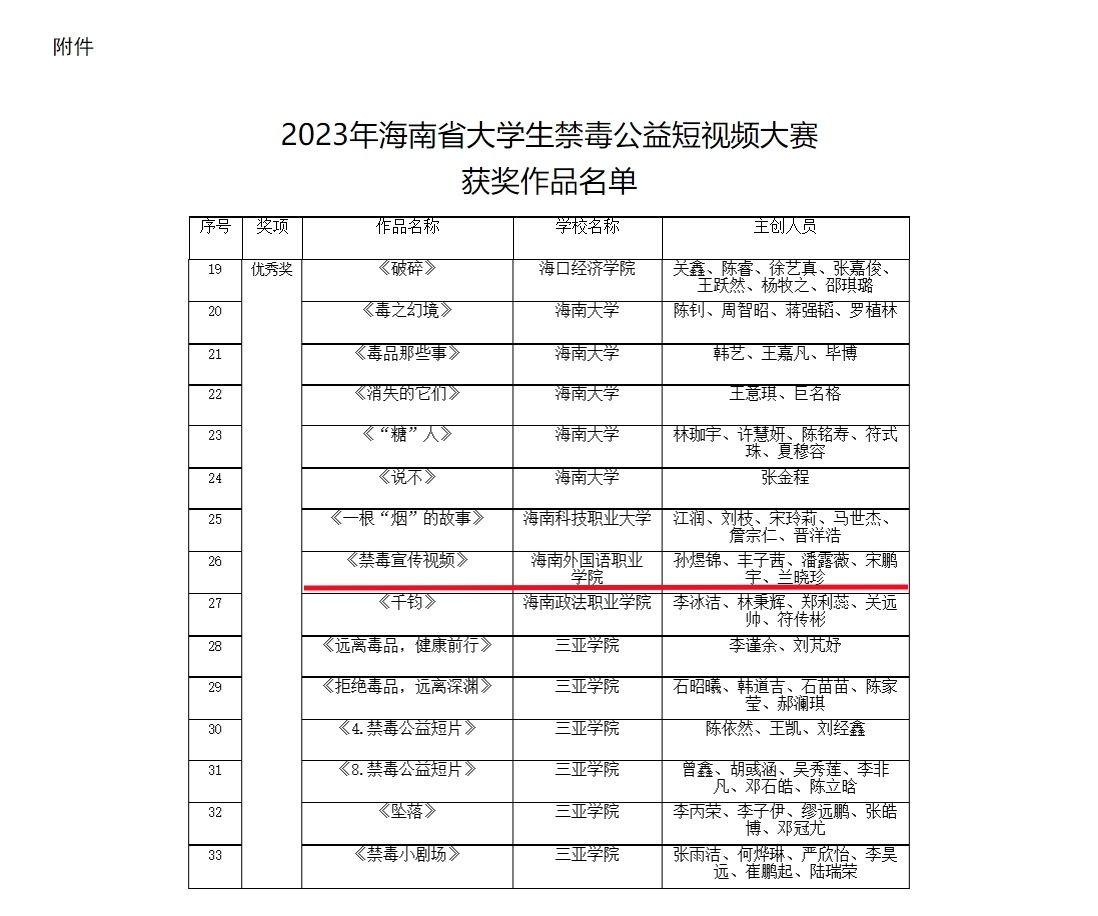 近日,省教育廳聯(lián)合省禁毒委員會(huì)辦公室部署開(kāi)展的主題為“建設(shè)海南自貿(mào)港無(wú)毒青春勇?lián)?dāng)”大學(xué)生禁毒公益短視頻大賽活動(dòng)落下帷幕,全省22所高校,約2500名大學(xué)生參與作品制作。我校學(xué)生孫煜錦、豐子茜、潘露薇、宋鵬宇、蘭曉珍共同創(chuàng)作的《禁毒宣傳視頻》在比賽中榮獲優(yōu)秀獎(jiǎng)。
