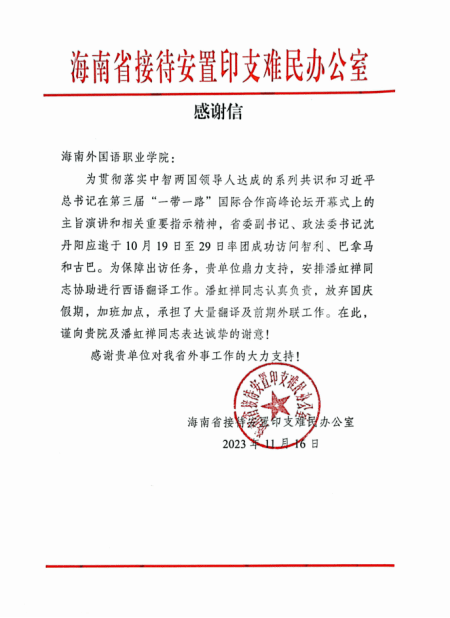 第二則感謝信來自省外事辦直屬單位——海南省接待安置印支難民辦公室。今年10月中旬,省委副書記、政法委書記沈丹陽應(yīng)邀率團(tuán)訪問智利、巴拿馬和古巴,就拓展與三國(guó)在人文、農(nóng)業(yè)、經(jīng)貿(mào)、衛(wèi)生健康、科技等領(lǐng)域務(wù)實(shí)合作達(dá)成一系列共識(shí)和合作意向。根據(jù)省領(lǐng)導(dǎo)出訪工作需要和要求,我校選派西方語言學(xué)院西班牙語教師潘虹禪于9月28日至10月17日協(xié)助開展西班牙語翻譯和前期外聯(lián)工作。由于任務(wù)緊急,潘虹禪老師在接到任務(wù)后就迅速安頓好家里便赴省會(huì)開展工作,放棄中秋和國(guó)慶假期休息的機(jī)會(huì),加班加點(diǎn),克服一切困難,承擔(dān)了大量翻譯任務(wù)及前期外聯(lián)任務(wù),并最終完滿協(xié)助完成各項(xiàng)工作。潘虹禪老師認(rèn)真負(fù)責(zé)的工作態(tài)度以及出色的專業(yè)水平得到撒謊上級(jí)部門和領(lǐng)導(dǎo)的一致好評(píng)。