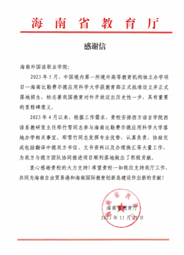 2023年5月,中國(guó)境內(nèi)第一所境外高等教育機(jī)構(gòu)獨(dú)立辦學(xué)項(xiàng)目——海南比勒費(fèi)爾德應(yīng)用科學(xué)大學(xué)正式落地招生。2023年4月以來,在海南比勒費(fèi)爾德應(yīng)用科學(xué)大學(xué)落地辦學(xué)相關(guān)事宜辦理期間,根據(jù)工作要求,我校選派西方語言學(xué)院西語系教研室主任鄭竹雪老師參與協(xié)助處理有關(guān)事項(xiàng),提供翻譯中德雙方書信、文書資料以及辦理換匯等服務(wù)。鄭竹雪老師以認(rèn)真嚴(yán)謹(jǐn)?shù)膽B(tài)度、專業(yè)周到的服務(wù)、無私奉獻(xiàn)的精神,為海南比勒費(fèi)爾德應(yīng)用科學(xué)大學(xué)完成落地辦學(xué)作出積極貢獻(xiàn),展現(xiàn)出過硬的專業(yè)水平和良好的業(yè)務(wù)素質(zhì),受到了省教育廳的高度肯定。省教育廳特發(fā)來感謝信,衷心感謝我校及鄭竹雪老師的大力支持。