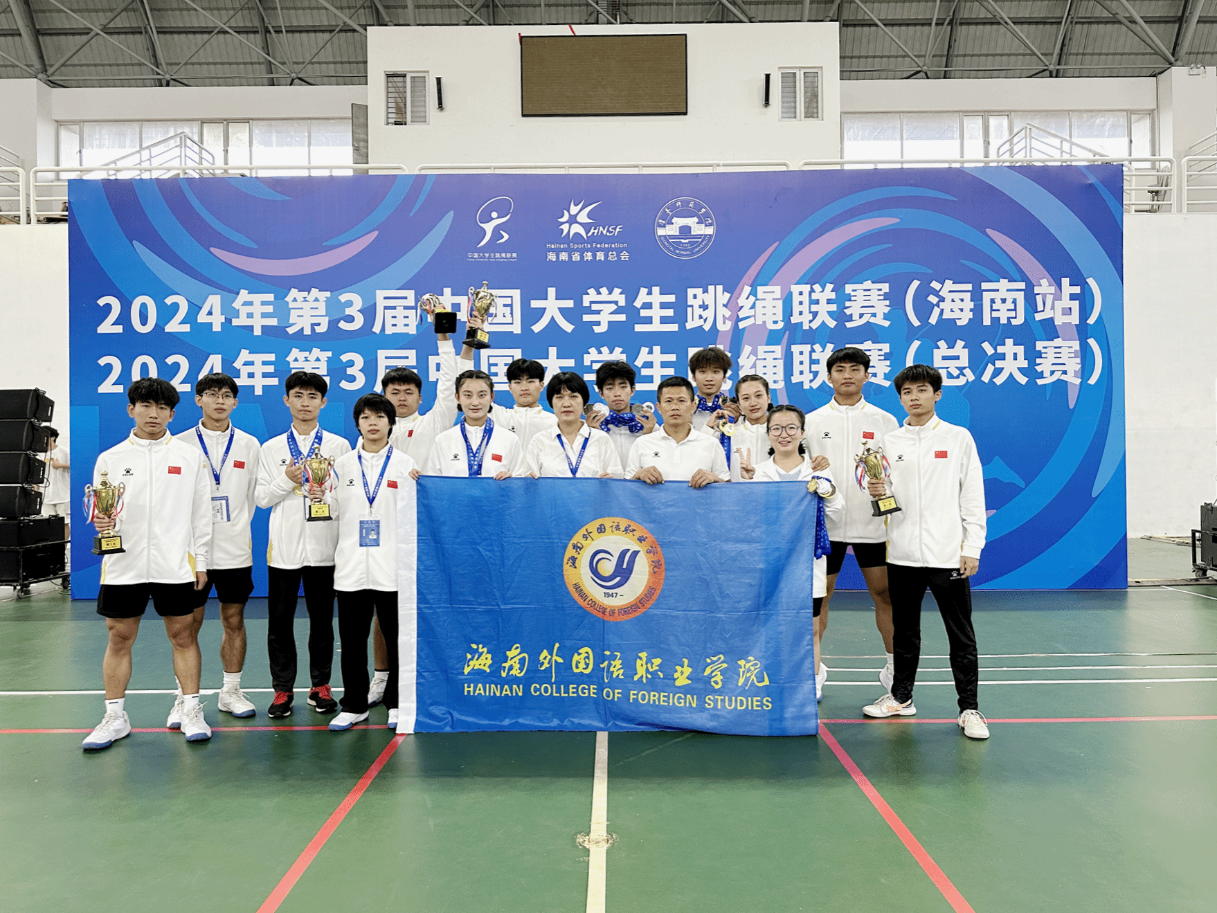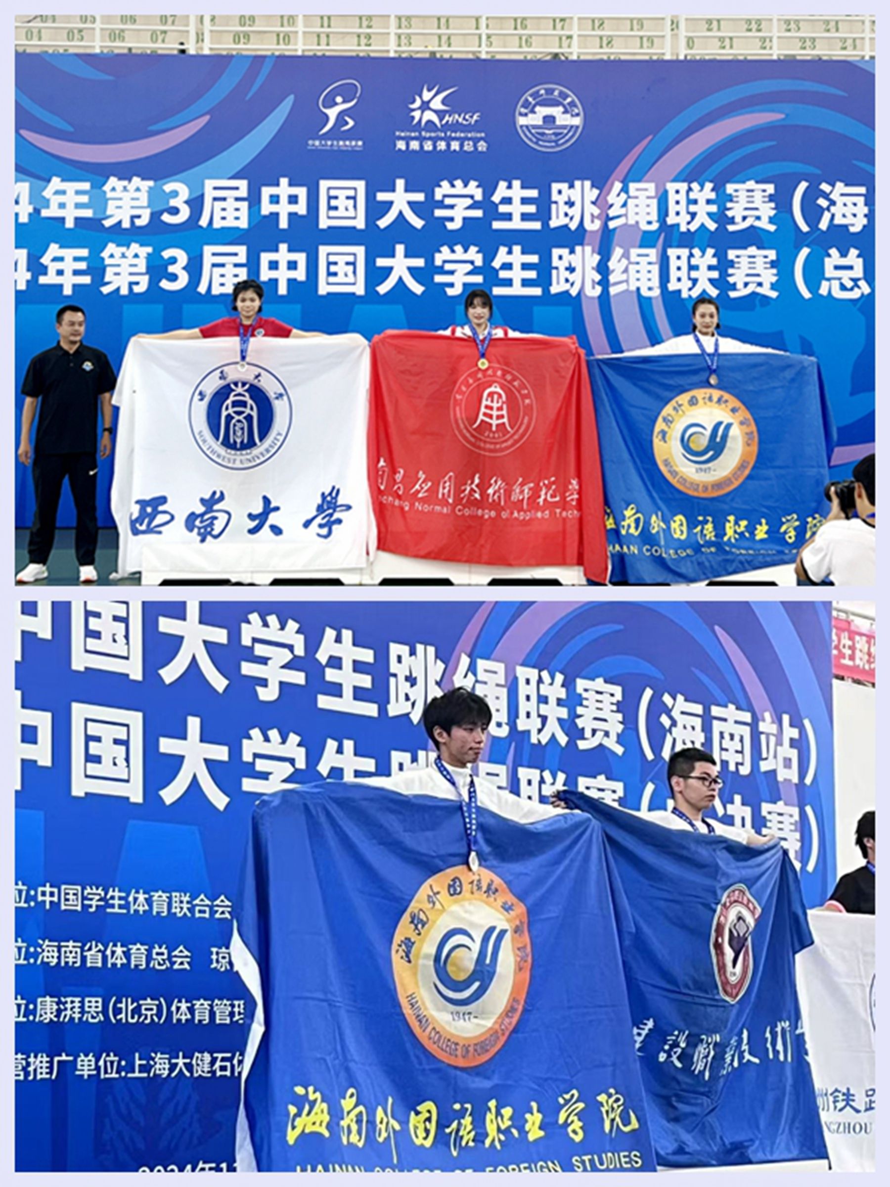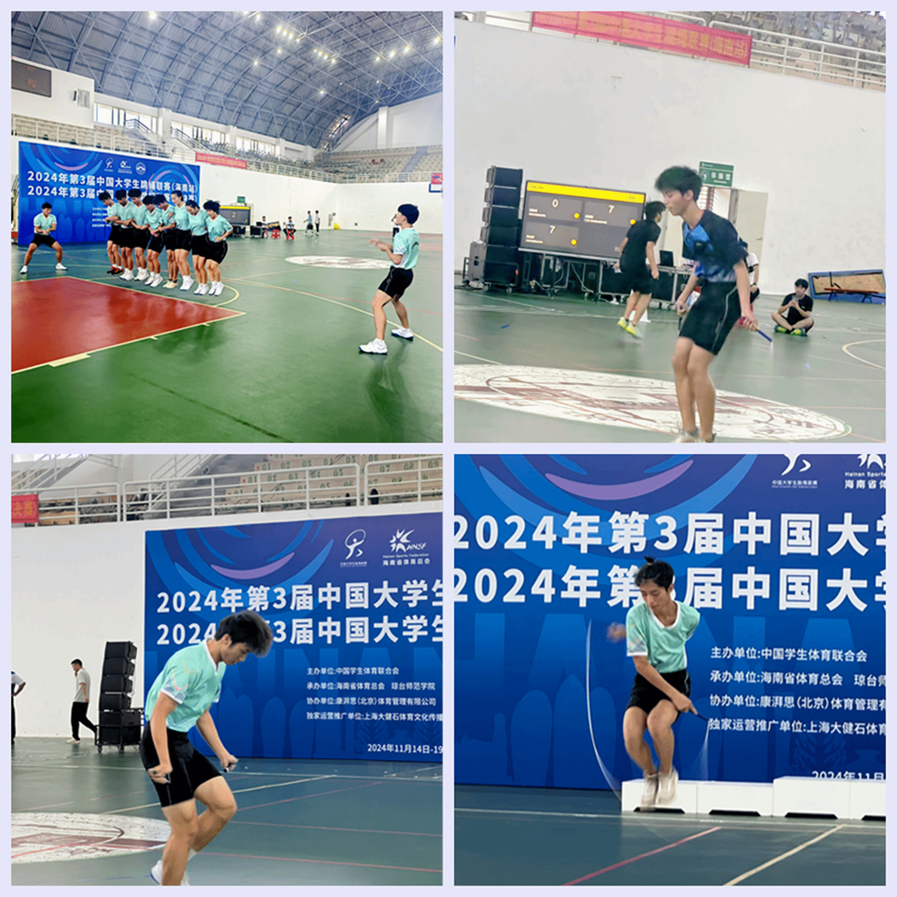 11月14日至18日,由中國(guó)學(xué)生體育聯(lián)合會(huì)主辦的2024年第3屆中國(guó)大學(xué)生跳繩聯(lián)賽在海口舉辦,來(lái)自全國(guó)多所知名高校,包括西南大學(xué)、上海財(cái)經(jīng)大學(xué)、廣州體育學(xué)院等,齊聚一堂,共同角逐榮譽(yù)。比賽分甲組(普通組)、乙組(高職高專組)及丙組(高水平組)三個(gè)組別,各組別設(shè)有計(jì)數(shù)賽、花樣賽、規(guī)定賽三個(gè)大項(xiàng)20個(gè)小項(xiàng)。我校跳繩隊(duì)分別參加乙組和丙組的比賽,經(jīng)過(guò)四天激烈的角逐,最終取得6金7銀3銅的優(yōu)異成績(jī),其中在首次參加的丙組跳繩比賽中獲得1金2銀2銅的好成績(jī),實(shí)現(xiàn)了新突破。同時(shí),徐曉娟和李廣兩位老師被評(píng)為比賽優(yōu)秀教練員。