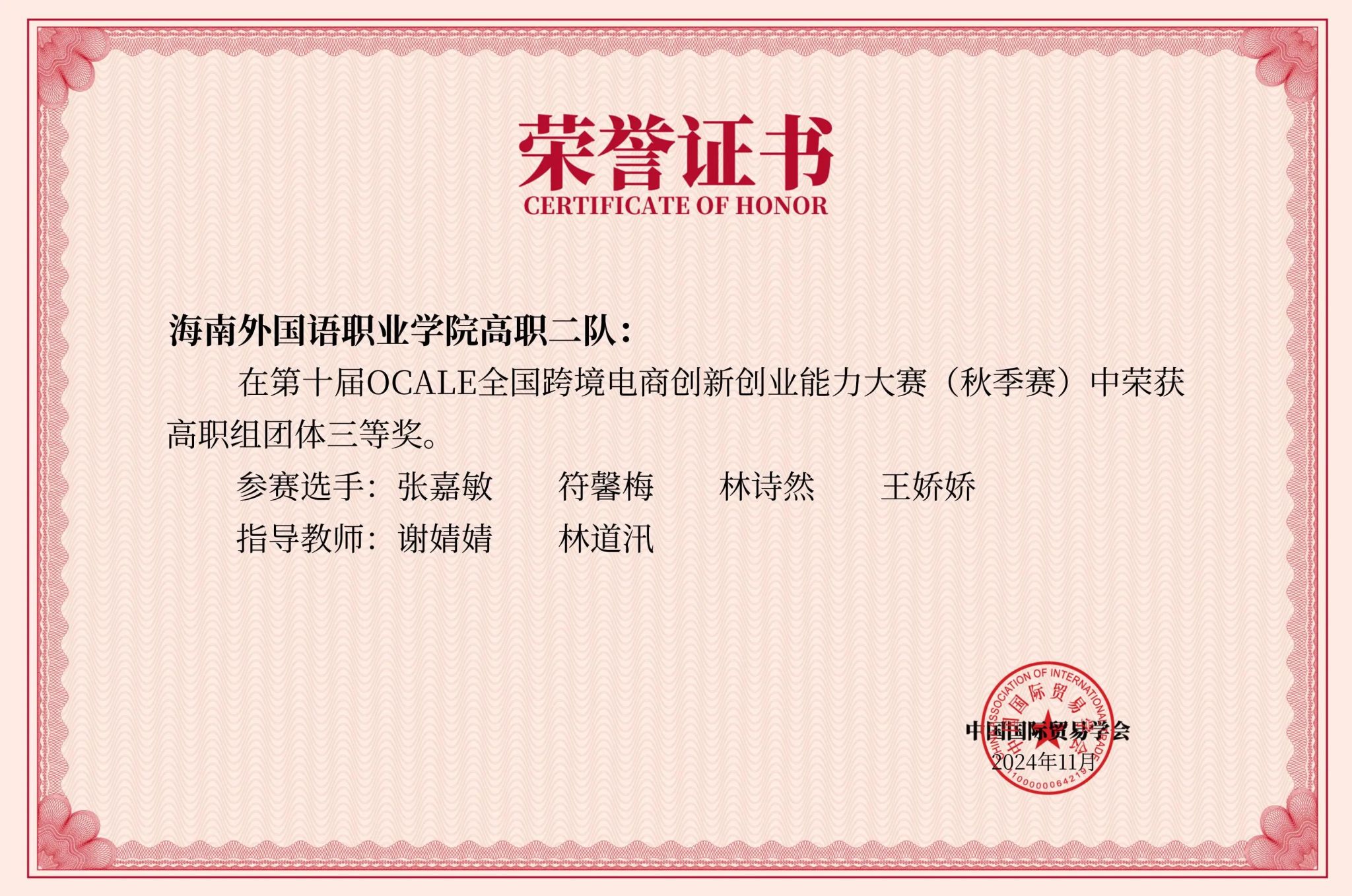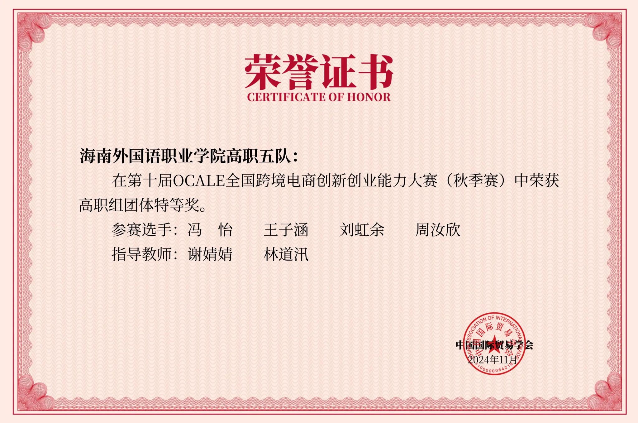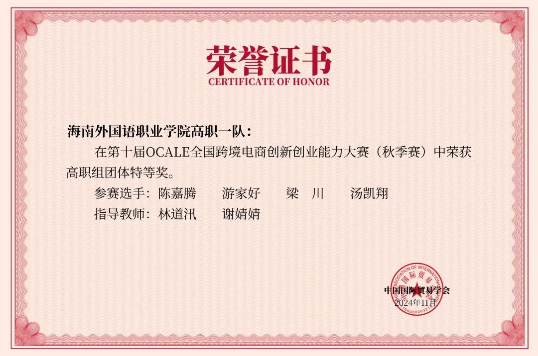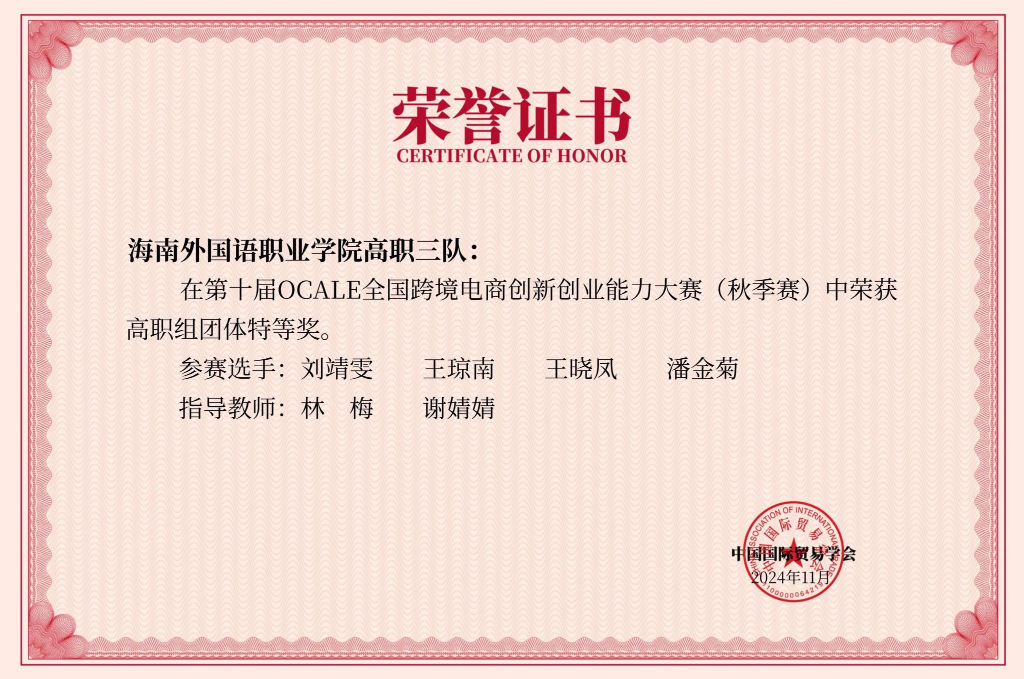 近日,由中國國際貿(mào)易學(xué)會舉辦的第十屆OCALE全國跨境電商創(chuàng)新創(chuàng)業(yè)能力大賽(秋季賽)順利結(jié)束。經(jīng)過激烈角逐,我校國際商務(wù)學(xué)院馮怡、劉虹余、周汝欣、王子涵同學(xué)團(tuán)隊(duì),潘金菊、王曉鳳、王瓊南、劉靖雯同學(xué)團(tuán)隊(duì)以及陳嘉騰、游家好、湯凱翔、梁川同學(xué)團(tuán)隊(duì)3支隊(duì)伍在大賽中表現(xiàn)優(yōu)異,分別斬獲全國特等獎;王嬌嬌、符馨梅、林詩然、張嘉敏同學(xué)團(tuán)隊(duì)獲得全國三等獎。謝婧婧、林梅、林道汛老師分別獲優(yōu)秀指導(dǎo)老師特等獎。