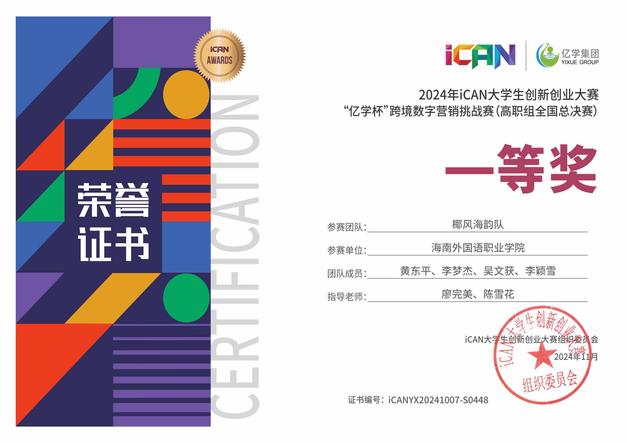 日前,2024年iCAN大學(xué)生創(chuàng)新創(chuàng)業(yè)大賽“億學(xué)杯”跨境數(shù)字營銷挑戰(zhàn)賽圓滿落幕,我校國際商務(wù)學(xué)院黃東平、李夢杰、吳文獲和李穎雪四位同學(xué)組成的代表隊在比賽中表現(xiàn)出色,榮獲全國一等獎。