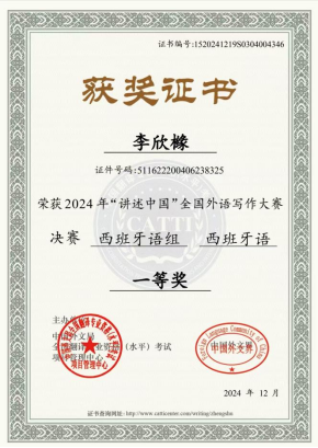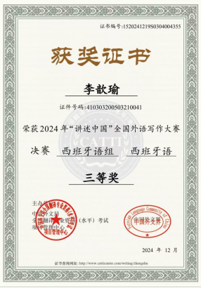 近日,由中國外文局全國翻譯專業(yè)資格水平考試(CATTI)項目管理中心與中國外文界共同主辦的2024年第三屆“講述中國”外語寫作大賽圓滿落幕。我校西方語言學(xué)院積極組織學(xué)生參賽,并在激烈競爭中取得了優(yōu)異成績,其中2023級應(yīng)用西班牙語專業(yè)的李欣櫞同學(xué)榮獲大賽西班牙語組一等獎,李歆瑜同學(xué)和許海燕同學(xué)分別獲得西班牙語組三等獎。