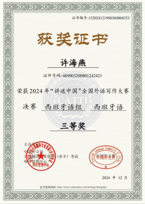 本次大賽西班牙語賽道不設(shè)分組,我校學(xué)生與全國各本科院校的專業(yè)選手同臺競技,展示了扎實的語言功底與對中華文化的深刻理解。我校首次組織學(xué)生參加該項比賽就取得了如此優(yōu)異的成績,創(chuàng)造了我校應(yīng)用西班牙語專業(yè)學(xué)生在全國性比賽中的歷史最佳成績,實現(xiàn)了新的突破。這一成績的取得展現(xiàn)了我校在西班牙語教學(xué)及學(xué)生綜合素質(zhì)培養(yǎng)方面的顯著成效,體現(xiàn)了我校對小語種專業(yè)高質(zhì)量發(fā)展的全力支持。本屆大賽主題為“用外語講述真實、立體、全面的中國”,旨在更好推動中華文化走出去,鼓勵用外語講述中國故事,通過賽事選拔更多優(yōu)秀人才,全面提升當(dāng)代大學(xué)生等各類群體的外語寫作能力和素養(yǎng),培養(yǎng)和發(fā)現(xiàn)優(yōu)秀的外語寫作人才,向世界闡釋推介更多具有中國特色、體現(xiàn)中國精神、蘊藏中國智慧的優(yōu)秀文化。根據(jù)大賽通知,入圍決賽并獲得二等獎及以上的選手及指導(dǎo)教師將自動進入中國外語人才庫,未來在專業(yè)提升、科研課題參與和培訓(xùn)等方面將獲得優(yōu)先邀請。未來,我校將此次比賽獲獎為契機,進一步總結(jié)經(jīng)驗,加強西班牙語學(xué)科建設(shè)和師資隊伍建設(shè),為學(xué)生提供更多展示自我、提升能力的平臺,助力我?!半p高”建設(shè)向高質(zhì)量發(fā)展,培養(yǎng)更多具有國際視野和傳播能力的高素質(zhì)外語人才,為服務(wù)國家“一帶一路”和海南自貿(mào)港建設(shè),講好“海南故事”和“中國故事”貢獻更大力量。
