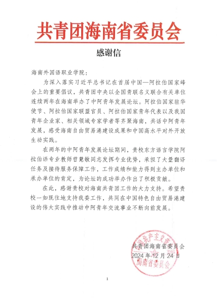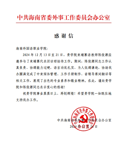 近日,我校收到省委外事辦、團(tuán)省委等單位發(fā)來的感謝信,感謝我校及兩位專業(yè)教師對(duì)我省重要外事活動(dòng)的支持與付出。