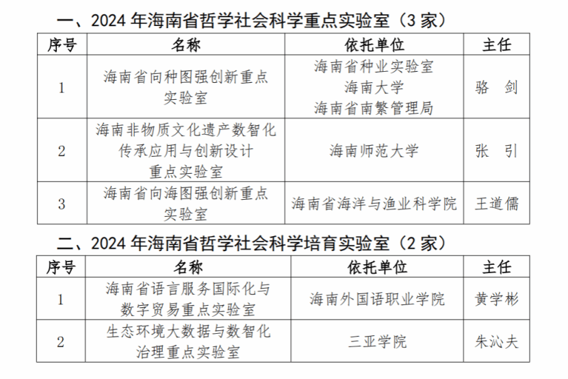 據(jù)悉,創(chuàng)建哲學(xué)社會(huì)科學(xué)重點(diǎn)實(shí)驗(yàn)室,是海南省貫徹落實(shí)黨中央提出的加快構(gòu)建中國特色哲學(xué)社會(huì)科學(xué)戰(zhàn)略任務(wù)和中共中央辦公廳印發(fā)的《國家“十四五”時(shí)期哲學(xué)社會(huì)科學(xué)發(fā)展規(guī)劃》的部署,在加快中國特色哲學(xué)社會(huì)科學(xué)“三大體系”建設(shè),促進(jìn)重點(diǎn)學(xué)科優(yōu)勢突出、新興學(xué)科和交叉學(xué)科創(chuàng)新發(fā)展,創(chuàng)新學(xué)術(shù)理論體系、學(xué)術(shù)研究組織體系、學(xué)術(shù)平臺(tái)支撐體系上,推出的學(xué)術(shù)研究創(chuàng)新平臺(tái)。自2022年海南省社科聯(lián)啟動(dòng)哲學(xué)社會(huì)科學(xué)重點(diǎn)實(shí)驗(yàn)室創(chuàng)建工作以來,共批準(zhǔn)建設(shè)12家重點(diǎn)實(shí)驗(yàn)室和2家培育實(shí)驗(yàn)室,初步形成“五向圖強(qiáng)”(“向種圖強(qiáng)”“向海圖強(qiáng)”“向天圖強(qiáng)”“向數(shù)圖強(qiáng)”“向綠圖強(qiáng)”)哲學(xué)社會(huì)科學(xué)重點(diǎn)實(shí)驗(yàn)室交叉學(xué)科創(chuàng)新發(fā)展學(xué)術(shù)研究平臺(tái)支撐體系。