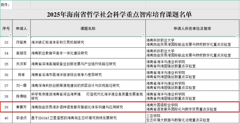 近日,海南省社會科學(xué)界聯(lián)合會公示了2025年海南省哲學(xué)社會科學(xué)重點智庫培育課題的立項名單,我校東方語言學(xué)院黃賽芳副教授申報的課題成功立項。