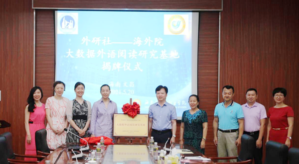 最后,楊學(xué)前副院長(zhǎng)、姚虹總經(jīng)理共同為“外研社—海南外國(guó)語(yǔ)職業(yè)學(xué)院大數(shù)據(jù)外語(yǔ)閱讀研究基地”揭牌,雙方代表合影留念。