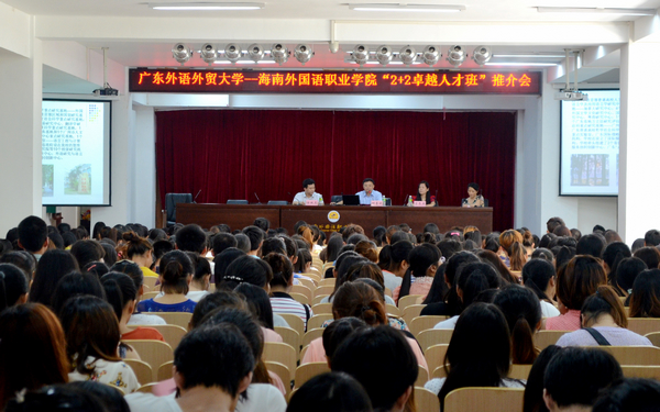 5月16日上午,廣東外語外貿(mào)大學(xué)—海南外國語職業(yè)學(xué)院“2+2卓越人才班”推介會在我院圖書館多功能報告廳舉行。此次共辦“2+2卓越人才班”,是我院深化與廣東外語外貿(mào)大學(xué)的合作,推進(jìn)人才培養(yǎng)深層次發(fā)展的又一重舉,旨在培養(yǎng)和打造應(yīng)用型、職業(yè)型高層次外語人才。