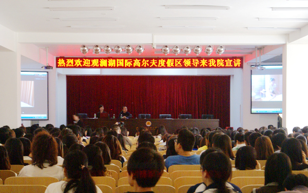 2月24日上午,圖書館多功能報告廳內(nèi)人頭涌動、氣氛熱烈,由球會總經(jīng)理?xiàng)钋嘞壬鷰ш牭挠^瀾湖國際高爾夫度假區(qū)宣講團(tuán)一行4人應(yīng)邀訪問我院,并在此作了一場精彩的宣講活動。教務(wù)處、應(yīng)用英語系、東語系、西語系、旅游外語系等部門有關(guān)負(fù)責(zé)人同200多名學(xué)生一起聆聽了宣講。宣講會由教務(wù)處劉明鵬處長主持。