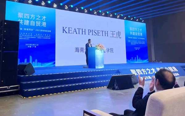 柬埔寨王國諾羅敦﹒西哈莫尼國王頂級智慧勛章獲得者、我校柬埔寨外教王虎(Keath Piseth)博士受主辦方邀請進(jìn)行了主題宣講,分享了來中國求學(xué)經(jīng)歷、在我校工作感受,講述了在海南教書育人、促進(jìn)中國和柬埔寨人文交流的故事,并邀請廣州高校的學(xué)子們加入海南自由貿(mào)易港建設(shè)大潮。