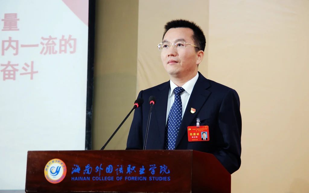 陳正強代表中國共產(chǎn)黨海南外國語職業(yè)學(xué)院第一屆委員會作題為《賡續(xù)精神血脈 凝聚奮進力量——為加快建設(shè)特色鮮明、開放包容、國內(nèi)一流的國際化高水平職業(yè)院校而團結(jié)奮斗》的工作報告。